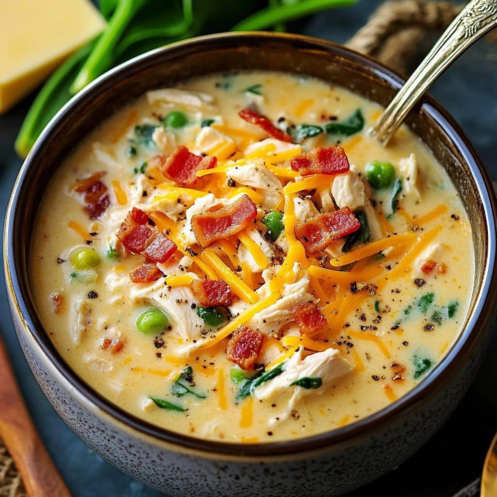 This creamy chicken bacon cheddar soup is the perfect comfort food for cold nights or lazy weekends. It’s thick, rich, cheesy, and packed with tender chicken, smoky bacon, sweet peas, and spinach for a pop of color and nutrition. Each spoonful is a delicious blend of creamy texture and savory goodness that will make everyone ask for seconds.