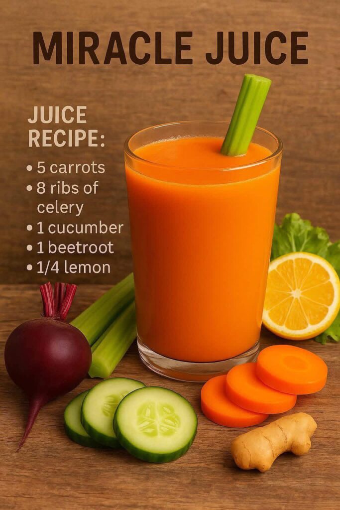 This Miracle Juice is a vibrant, nutrient-rich drink made from fresh vegetables and a splash of lemon. It’s called Miracle for a reason — it cleanses your body, boosts your immunity, improves your digestion, energizes you naturally, and supports glowing skin. The combination of carrots, celery, cucumber, beetroot, and lemon makes this juice a powerhouse of vitamins, minerals, and antioxidants.