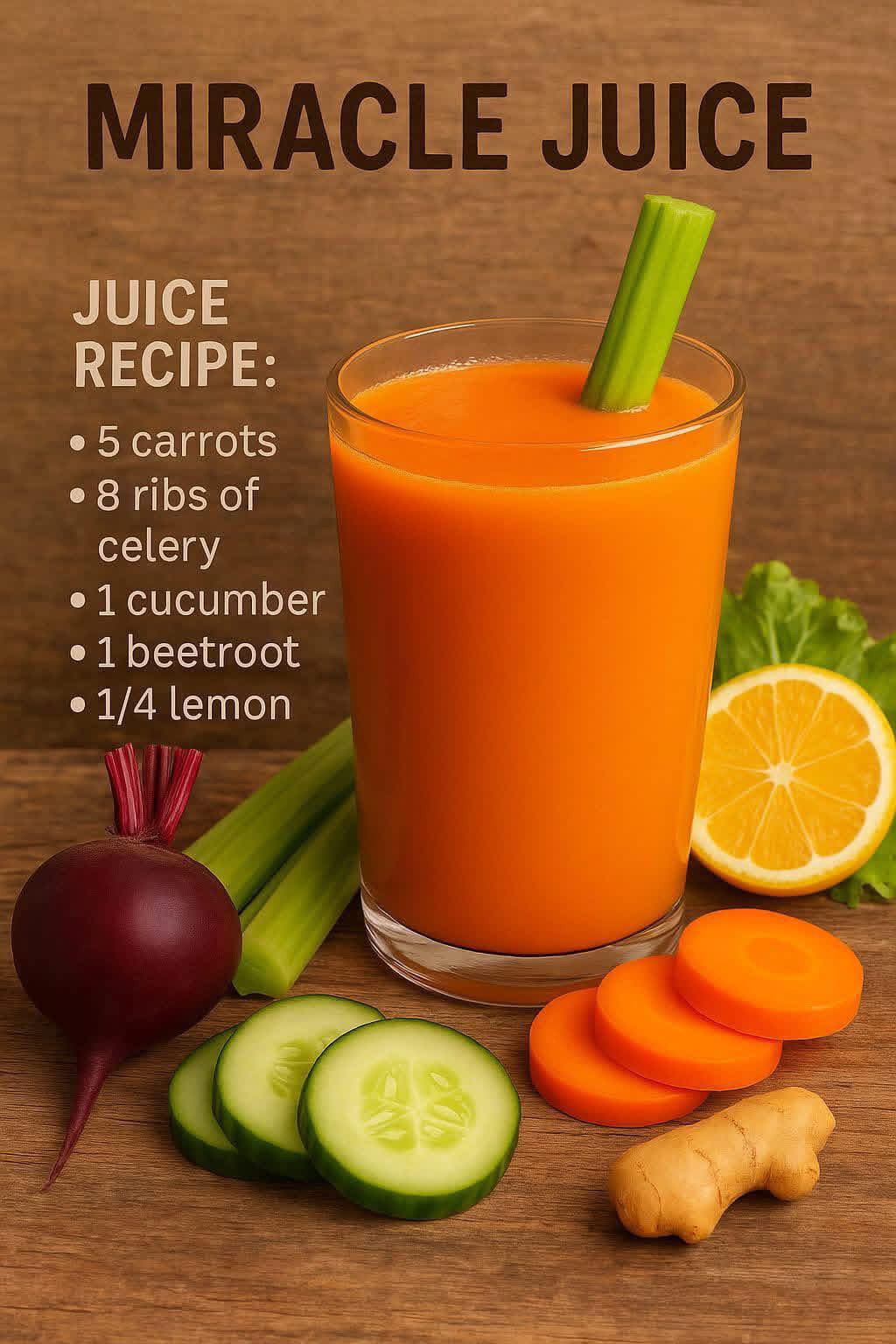 This Miracle Juice is a vibrant, nutrient-rich drink made from fresh vegetables and a splash of lemon. It’s called Miracle for a reason — it cleanses your body, boosts your immunity, improves your digestion, energizes you naturally, and supports glowing skin. The combination of carrots, celery, cucumber, beetroot, and lemon makes this juice a powerhouse of vitamins, minerals, and antioxidants.